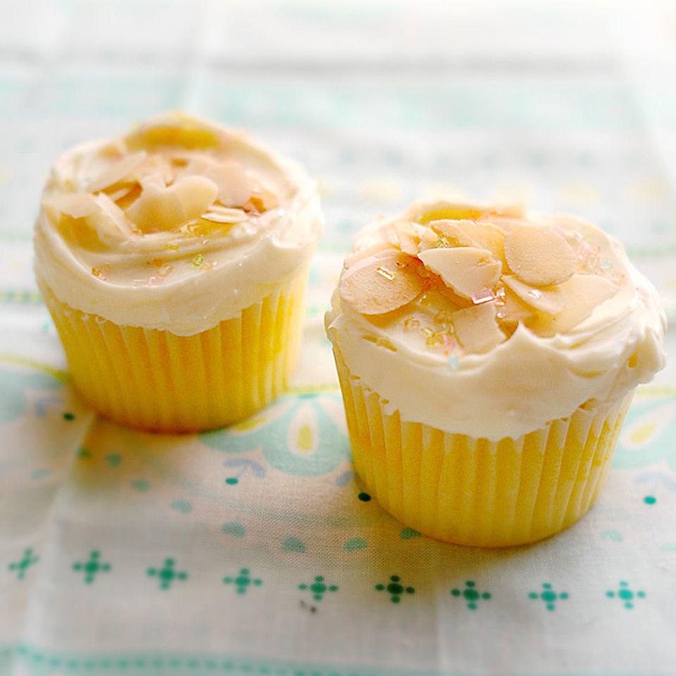 6. Spread icing on cooled cupcakes. Refrigerate leftovers.close up view of Lemon Cupcakes with white icing and almonds on top, on a blue and white table cloth