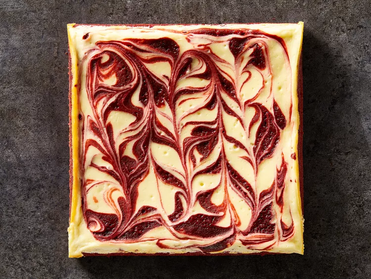 Spoon cream cheese mixture in dollops over the batter in pan; gently smooth tops of dollops even with batter using a knife or offset spatula. Do not overmix. Drizzle reserved 1/4 cup of batter over the dollops of cream cheese mixture. Drag a knife or skewer through the batter and cream cheese mixture to create swirls.