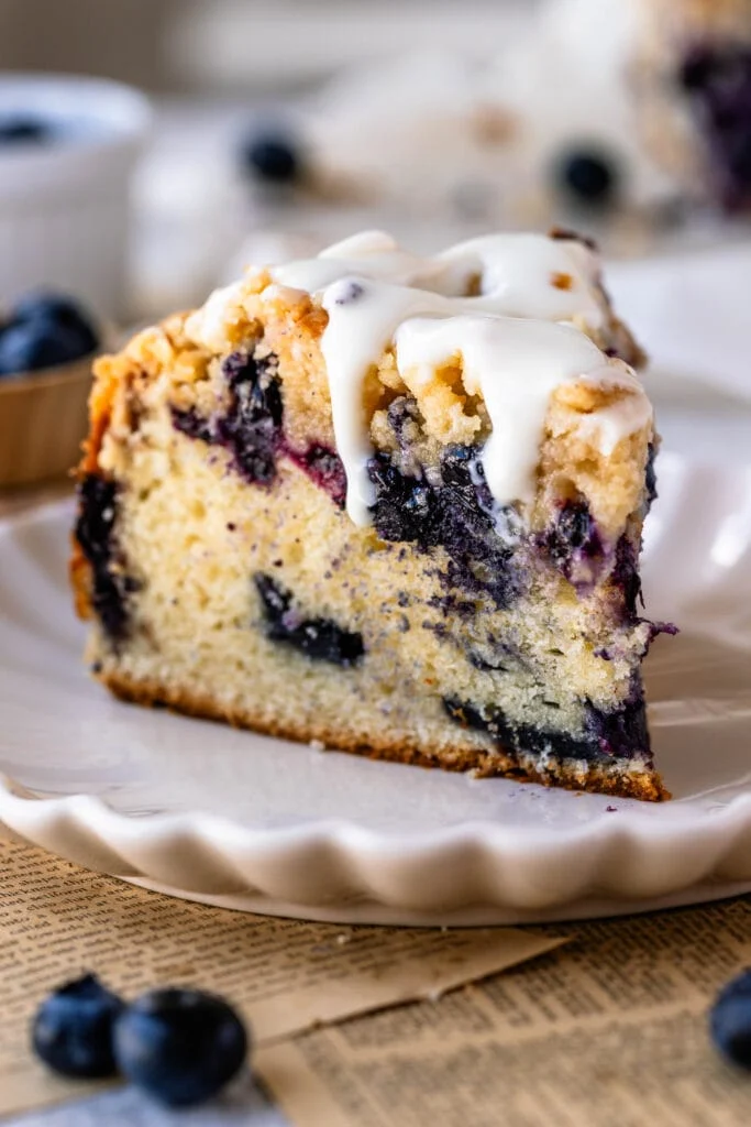 This delicious Blueberry Coffee Cake is soft, tender, and loaded with blueberries. It’s made with sour cream, which makes it extra rich and fluffy. The cake features a delightful streusel on top, and a cream cheese glaze.