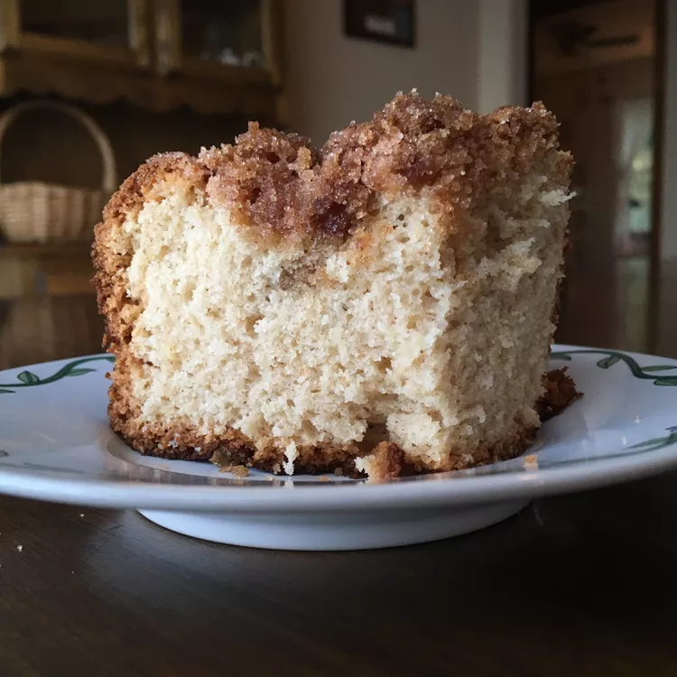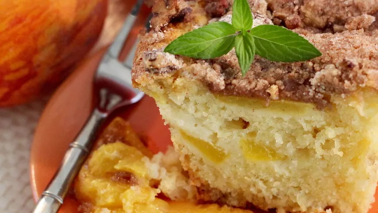 This is a great peach coffee cake recipe. I came up with it when our white peach tree yielded so many peaches, I had to figure out many ways to use them. Even my kids love this coffee cake — they will eat it all day!